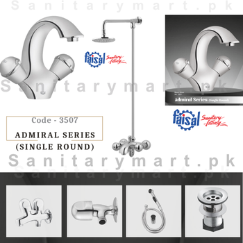Faisal sanitary Fittings – Admiral Series – Single Lever Basin Mixer Item # 3501 – Wall Shower / Hand Shower Type Item # 3502 – Double Bib Cock Item # 3503 – Tee Stop Cock Item # 3504 – Waste Basin Item # 3505 – Toilet Shower Complete With pipe Item # 3506
