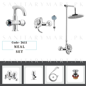 The Idrees Sanitary Fittings NEAL SET is an all-inclusive bath set featuring eight essential components designed to enhance your bathroom experience.